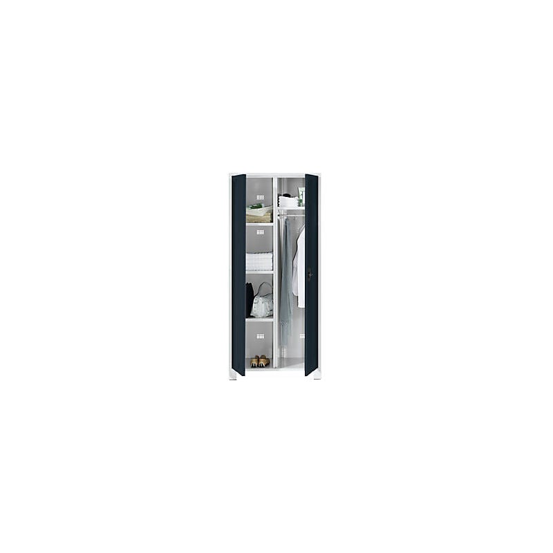 Armadio multiuso e armadio guardaroba, con asta appendiabiti, 6 scomparti, larghezza 800 mm, corpo in grigio chiaro, ante in grigio antracite. Fornitura = montato. Altezza = 1800 mm. Profondità = 500 mm. Larghezza = 800 mm. Colore corpo = grigio chiaro RAL 7035. Colore porta = grigio antracite RAL 7016. Serratura = chiavistello girevole di sicurezza per lucchetto. Numero scomparti in larghezza = 2 pz. Numero scomparti = 6 pz. Larghezza scomparti = 400 mm. Materiale = lamiera d'acciaio, saldata a punti. Altezza armadietto = 1695 mm. Dotazione interna = 3 ripiani a sinistra, cappelliera, asta appendiabiti a destra. Tipo di porta = anta a battente. Altezza scomparti = 4x420 / 1x290 / 1x1400 mm. Larghezza ripiani = 400 mm. Struttura = saldata a punti. Superficie = con verniciatura a forno. Con chiavistello girevole di sicurezza: da chiusa, la serratura può essere ruotata di 360°, contro i tentativi di apertura forzata. Finecorsa di apertura a 100° integrato. Aerazione mediante fori sulle