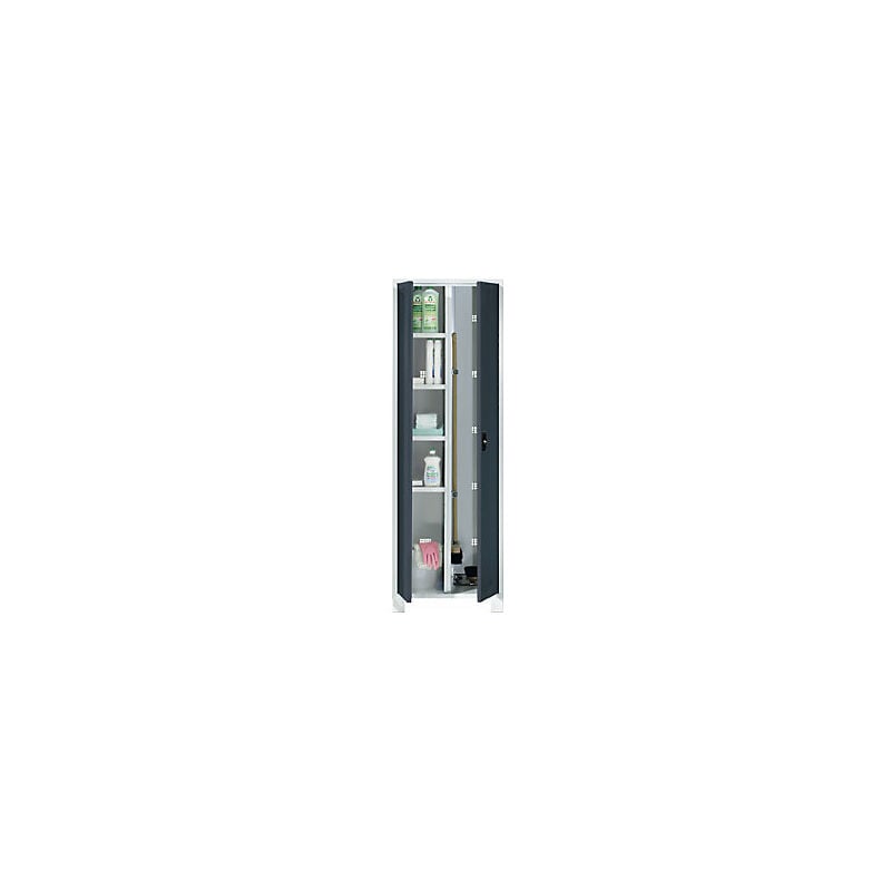 Armadio multiuso e armadio guardaroba, con fermo a clip, 6 scomparti, larghezza 800 mm, corpo in grigio chiaro, ante in grigio antracite. Fornitura = montato. Altezza = 1800 mm. Profondità = 500 mm. Larghezza = 800 mm. Colore corpo = grigio chiaro RAL 7035. Colore porta = grigio antracite RAL 7016. Serratura = chiavistello girevole di sicurezza per lucchetto. Numero scomparti in larghezza = 2 pz. Numero scomparti = 6 pz. Larghezza scomparti = 400 mm. Materiale = lamiera d'acciaio, saldata a punti. Altezza armadietto = 1695 mm. Dotazione interna = 4 ripiani a sinistra, 4 supporti di fissaggio a destra. Tipo di porta = anta a battente. Altezza scomparti = 4x280 / 1x570 / 1x1695 mm. Larghezza ripiani = 400 mm. Struttura = saldata a punti. Superficie = con verniciatura a forno. Con chiavistello girevole di sicurezza: da chiusa, la serratura può essere ruotata di 360°, contro i tentativi di apertura forzata. Finecorsa di apertura a 100° integrato. Aerazione mediante fori sulle ante e sulla