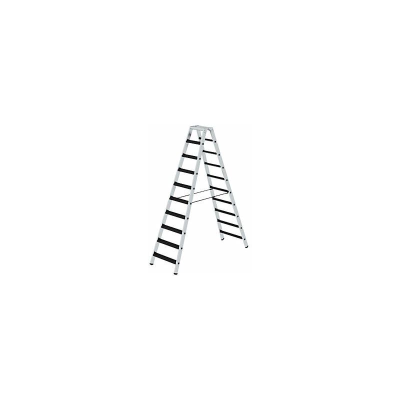 Scala a libro a gradini, salita su due lati, versione imbottita, 2 x 10 gradini. Fornitura = montato. Tipo di prodotto = scale a libro a gradini, salita su due lati. Altezza di lavoro = 3975 mm. Salita = su due lati. Versione da salita = gradini. N. gradini, piattaforma inclusa = 2x10 pz. Materiale telaio = alluminio. Materiale gradini = alluminio con rivestimento antisdrucciolo. Profondità gradini = 80 mm. Peso = 14.5 kg. Caratteristiche = pieghevole. Portata = 150 kg. Altezza verticale = 2315 mm. Larghezza esterna in basso = 631 mm. Qualità professionale, ideali per l'uso quotidiano. Robusta struttura in alluminio. Struttura rastremata per un appoggio stabile e sicuro. Robustissime cerniere di sicurezza avvitate in quattro punti. Montanti rinforzati con requisiti superiori a EN 131. Montanti e gradini in profilati estrusi di alluminio. Durevole flangiatura multipla dei gradini e dei pioli. Alta resistenza alla torsione. Distanza gradini 235 mm. Cinghie di fissaggio altamente