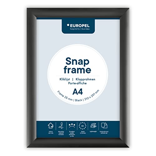 EUROPEL Snap Frame Nero A4, 25 mm | Struttura in alluminio anodizzato e copertura antiriflesso | Porta poster a clip per display pubblicitari e vendita al dettaglio | Cornice per bacheca per pareti