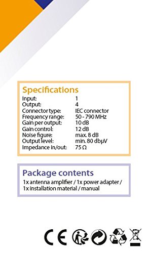 ✅ Tensione di ingresso 6 VDC ✅ Spina Euro / Type C (CEE 7/16) ✅ Livello di uscita 80 dBuV ✅ Perdita di inserimento 8 dB ✅ Gamma di frequenza 50-790 MHz ✅ Guadagno per uscita 10dB ✅ Impedenza 75W ✅ Potenza assorbita funzionamento 100mA
