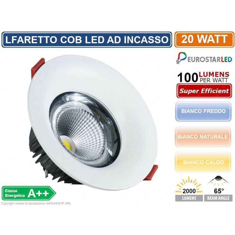 Faretto COB LED da incasso con potenza di 20W. Forma rotonda in alluminio di colore bianco. LED COB con fascio luminoso di 65°, flusso luminoso di 2000 lm . Questa lampadinaha un rapporto di 100 lm/W . Incluso driver con morsetti a clip per la connessione all'impianto. La lampada è dotata anche di mollette di fissaggio. Elegante e adatto all'incasso nei controsoffitti in cartongesso o legno, può essere sostituito in uffici, showroom e sale conferenze. Questo modello di faretto è disponibile con 3 diverse temperature colore: Luce Bianca Calda 2700/3000K (LS9020B-20W-WW), Bianca Naturale 4000K/4500 (LS9020B-20W-NW) e Bianca Fredda 5500/6000K (LS9020B-20W-CW). Dimensioni: Ø 150 x 80 mm. Dimensioni incasso: Ø 110 mm.