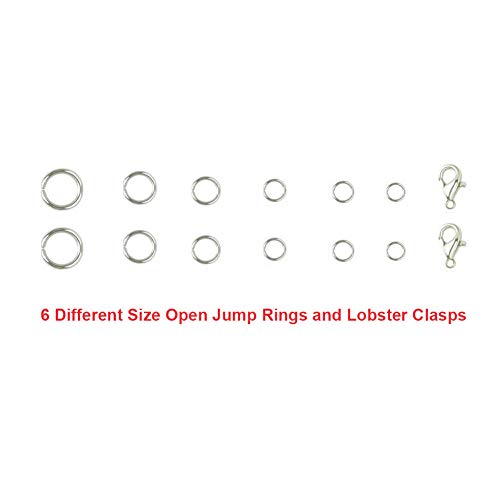 La confezione include 20 fermagli per aragosta (12 mm) e 1480 pezzi di anello di salto aperto che hanno 6 misure (10 mm, 8 mm, 7 mm 6 mm, 5 mm, 4 mm) in colore argento brillante. La confezione contiene anche 1 pinzetta, 1 pinza a becchi mezzotondi e 1 apriscatole per anelli di salto.
