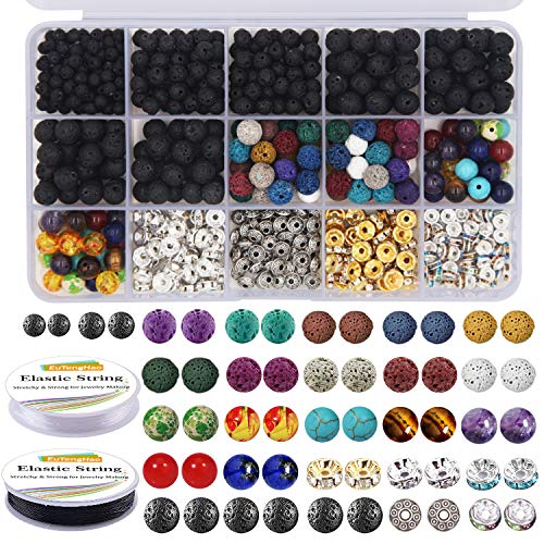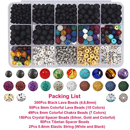 Totalmente 600 perline includono 300 perline laviche nere (dimensioni perline di 4 mm, 6 mm, 8 mm), 49 perline laviche colorate (8 mm di lava), 50 perline chakra (8 mm), 200 perline distanziali per braccialetti e due rotoli da 0,8 mm di corda trasparente per braccialetti e gioielli fai da te.