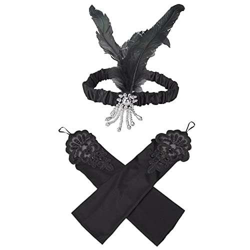 Euvoym 2 pezzi 1920s accessori flapper set di guanti deluxe flapper costume senza dita guanti in pizzo con fascia piuma per donne ruggenti anni '20 accessori per la decorazione della festa