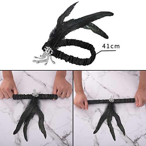 Bellissimo look: I guanti in pizzo nero degli anni '20 sono intarsiati con un abbellimento di cristallo, pieno di misterioso e fascino. La fascia in piuma nera viene fornita con elastico, piuma e gioiello, che lo rende molto elegante.