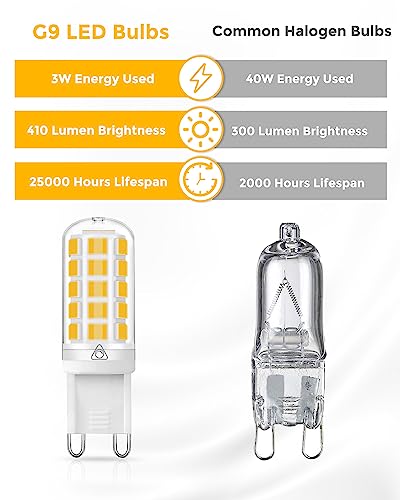 【Lampadine ad alto CRI e bianco caldo】La lampadina G9 dimmerabile a 3000K bianco caldo emette 410lm di luce bianca morbida e calda con CRI> 80 Ra (indice di resa cromatica), fa apparire i progetti vividi come il giorno, crea una notte chiara per la tua famiglia. L'esclusiva funzione di protezione degli occhi può proteggere molto bene la vista della vostra famiglia.
