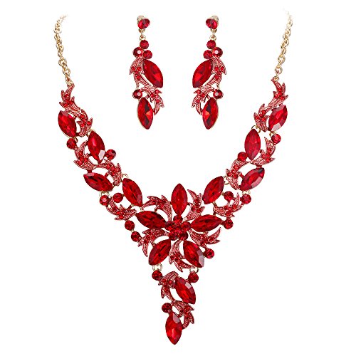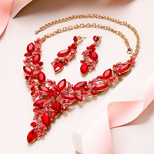 EVER FAITH Set Gioielli Donna, Cristallo Festa Moda Fiore Foglia Orecchini Collana Set Rosso Oro-Fondo