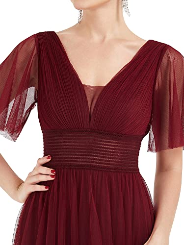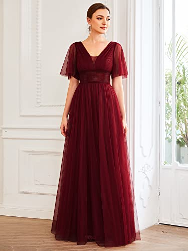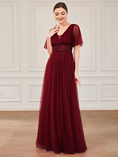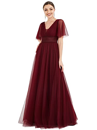 Ever-Pretty Abiti da Sera Lungo Donna Tulle Scollo a V Maniche Corte Linea ad A Plissettato Chic Vestito da Sera Borgogna 56