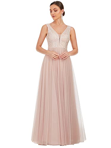 Ever-Pretty Vestito da Sera Donna Lungo Tulle Linea ad A Scollo a V Senza Maniche Chic Abito da Sera Arrossire 40