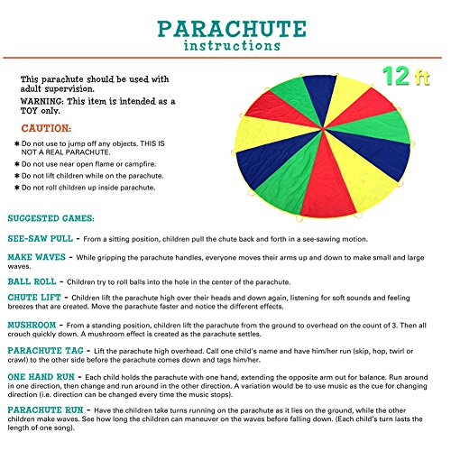 Dimensioni del paracadute: 3,6 m di diametro, 12 manici consentono a più bambini di giocare e divertirsi allo stesso tempo. Perfetto per le feste!