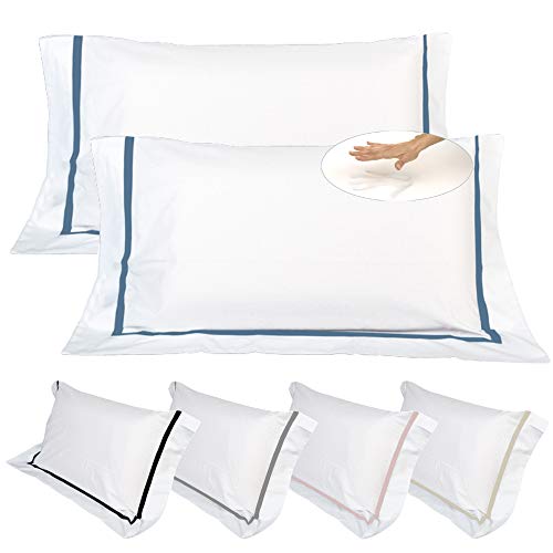 EVERGREENWEB - Cuscini Letto Coppia 100% Memory Foam Alti 12 cm con Elegante Set di 4 Fodere Gratis in Morbido Cotone Bianco + Balza e Riga Blu, 2 Guanciali per dolori CERVICALI in Schiuma Ergonomica