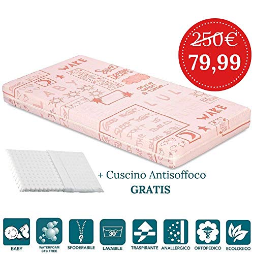 ✅ Materasso per Bambini 70x140 per Lettino o Culla Neonato alto 12 cm con Guanciale ANTISOFFOCO h 3 cm in Omaggio progettato su misura per garantire il costante sostegno della testa del Bambino durante movimenti notturni. Cuscino è anche Antireflusso con Fodera in Cotone Naturale Anallergico e Antibatterico Lavabile in Lavatrice a 30° colore Bianco e Rosa - Modello MINNY