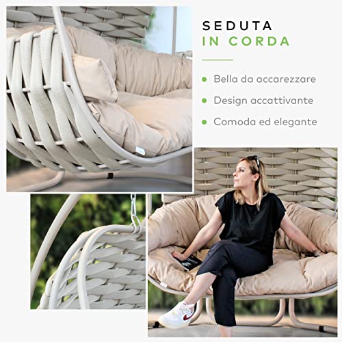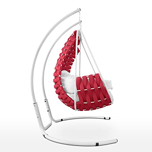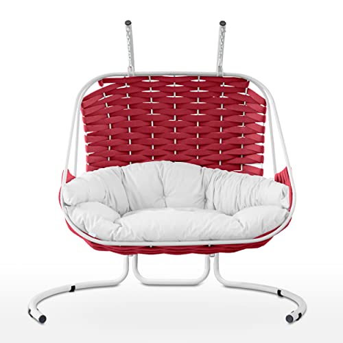 EVERGREENWEB - Poltrona Sospesa Doppia in Tessuto imbottito in foam intrecciato a mano, Sedia a Dondolo per Intero ed Esterno, completa di struttura in Acciaio e Cuscini - AutoPortante - Dubai Rossa