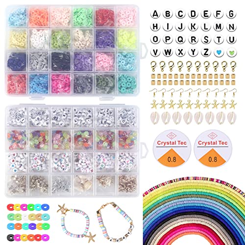 【Il Set Include】Un totale di 24 colori di perline di argilla, ogni colore è di circa 200 pezzi, 50 x lettere dell'alfabeto nero, 50 x lettere dell'alfabeto colorate, 50 x lettere dell'alfabeto colorate bianche, 50 x perline quadrate, 50 x stelle, 8 x conchiglie, 10 x stelle marine, 40 x cerchi dorati, 10 x cerchi d'argento, 20 x clip di aragosta, 50 x bottoni ricoperti, 8 x ciondoli, 2 x corde elastiche. L'intera scatola è di circa 5100 pezzi.