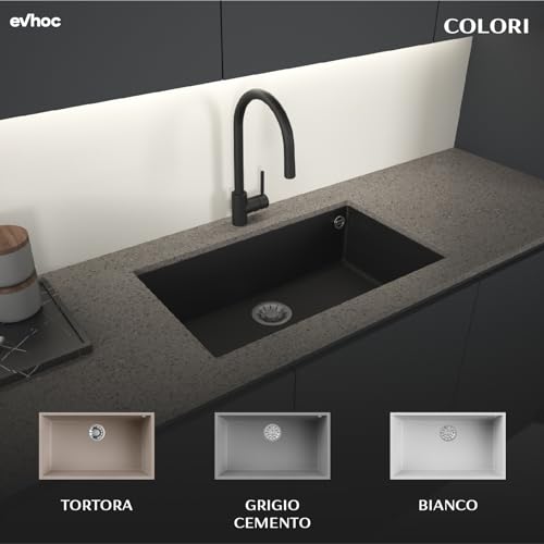 EVHOC - Lavello Cucina 1 Vasca UNICUM L Sottotop - Nero 100% in Kuarzite - Lavandino da Integrare al Mobile Cucina Nero Sottotop Made in Italy