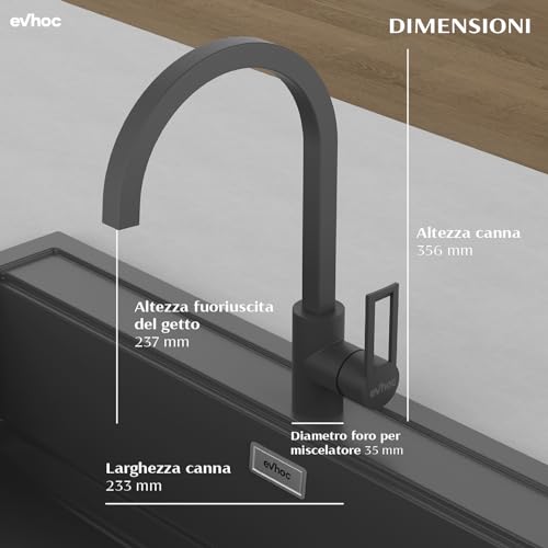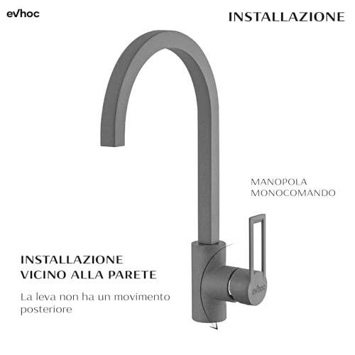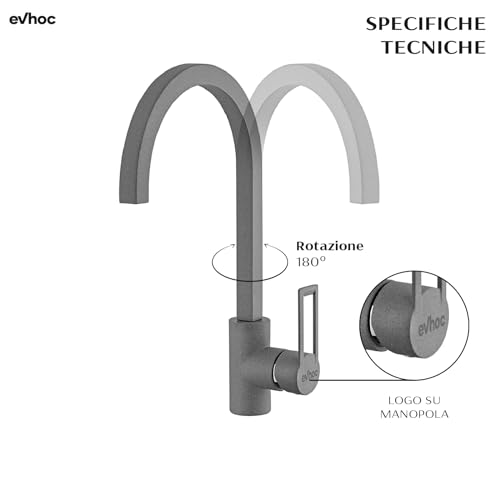 EVHOC Rubinetto di Design per Lavello Cucina VENUS, Miscelatore Monocomando con Canna Squadrata e Sistema di Risparmio Energetico, Girevole a 180°, Made in Italy, Grigio