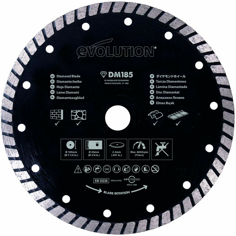 Ideale per taglio mattoni, cemento e pietra. Lama temprata corpo assicura la lama corre realistici per più a lungo. Alta concentrazione di diamante per longevità. Adatto solo per uso con una sega Evolution Rage Veloce pulito e preciso Cuting capacità 185 mm Lama diamantata. Lama diamantata di alta qualità. In grado di tagliare pietra naturale, calcestruzzo, mattoni, piastrelle e ceramica. Diametro lama 185 mm. Velocità massima 8000rpm. Alesaggio 20 mm. kerf 2,5 mm.