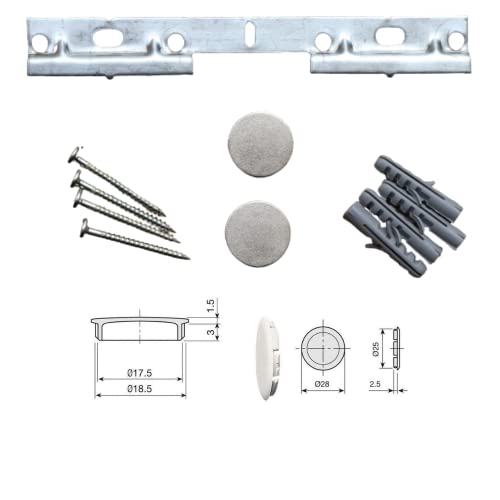 CONTENUTO DELLA CONFEZIONE: Gancio Sinistro - Gancio Destro - Cover Estetiche per foro d25mm - 4 Tasselli 8x40 con relative viti - Piastra doppia per muro