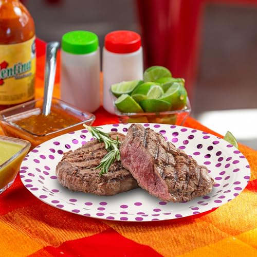 EVYIENEN Set di 125 piatti di carta bianchi viola a pois, accessori per feste, set di piatti di carta, 25 ospiti, piatti di carta, tovaglioli, cannucce per baby shower, compleanno, matrimonio