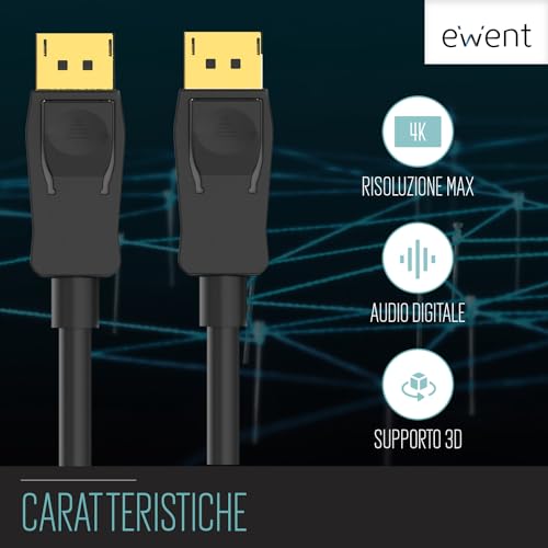 Ewent EC1400, Cavo Display Port 1.2, Risoluzione 4K e 3D con Audio Digitale, Compatibilità Universale, Supporta 3D, Lunghezza 1 m, Colore Nero, Cavo per Monitor