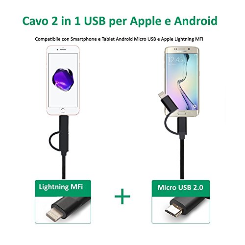 MFI Certificato. 2 in 1 Cavo Lightning Micro USB. Questo cavo robusto con due funzioni è assolutamente la soluzione giusta per chi possiede dispositivi Apple e Android. Una buona efficienza di carica e trasmissione dei dati rapida