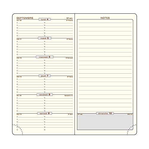 'La Settimana su 1 Pagina a l' orizzontale di un unico colpo d' occhio, 1 pagina di note, ampio tempo di amplitude del Lunedi al Sabato (8H a 19H) + Domenica intero (non di indicazione di orari).