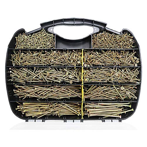 T.K.Excellent Cassetta di viti da truciolato assortite Pozidriv, testa piatta, con zincatura gialla,1600 pezzi