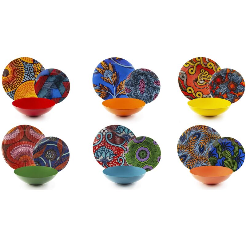 Materiali di alta qualità: realizzati con porcellana di prima scelta per i piatti piani e i piatti frutta, e ceramica stoneware resistente per i piatti fondi, offrendo un'esperienza elegante, robusta e versatile. Dimensioni ideali: i piatti piani presentano un diametro di 27 cm, un'altezza di 3 cm e un peso di 710 grammi, i piatti fondi hanno un diametro di 20,5 cm, un'altezza di 5,5 cm e un peso di 505 grammi, mentre i piatti frutta hanno un diametro di 20,5 cm, un'altezza di 2,5 cm e un peso di 340 grammi. Le dimensioni ben bilanciate dei piatti offrono una presentazione perfetta per ogni portata. Piatti piani e frutta con decoro Ghana, piatti fondi tinta unita in 6 colori assortiti: rosso, giallo, arancio, verde, rosa salmone e azzurro. Praticità senza compromessi: i piatti di questo set sono sicuri da utilizzare sia in lavastoviglie che in microonde, offrendo la massima comodità senza compromettere la qualità o l'integrità dei piatti. Versatile per ogni occasione e perfetto per 6