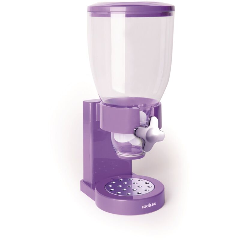 Descrizione Dispenser cereali singolo. Materiale: coperchio e struttura in ABS. Contenitore in SAN. Ruota girevole: gomma. Misura in centimetri: 20x18. Altezza: 34 cm. Tappo di chiusura salva freschezza. Griglia d'appoggio cromata. Lavaggio a mano. Colore: lilla. Contenuto della confezione Dispenser singolo, 0.5 lt