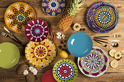 SERVIZIO PIATTI 18 PEZZI, PER SERVIRE FINO A 6 PERSONE: il servizio piatti Mandala Etno di Excelsa è composto da 18 pezzi, realizzati in porcellana decorata (piatti piani e piatti frutta) e stoneware (piatti fondi) ed è adatto per ogni occasione. I colori brillanti e le decorazioni geometriche ispirate ai Mandala daranno un tocco etnico e fascinoso alla tua tavola sia per occasioni informali, come pranzi e cene di tutti i giorni, sia per feste e cene con gli amici