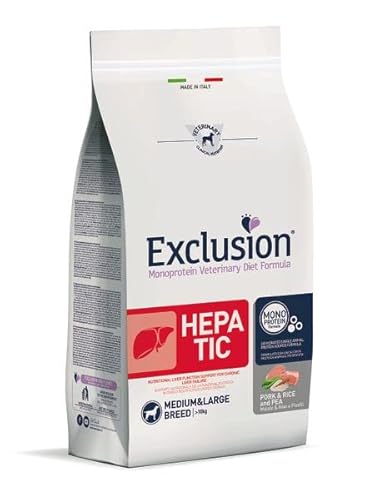 ��Le crocchette Exclusion monoprotein vet diet hepatic medium e large breed sono un alimento completo dietetico per cani adulti formulato per il supporto della funzione epatica in caso di insufficienza epatica cronica e per la riduzione del rame nel f