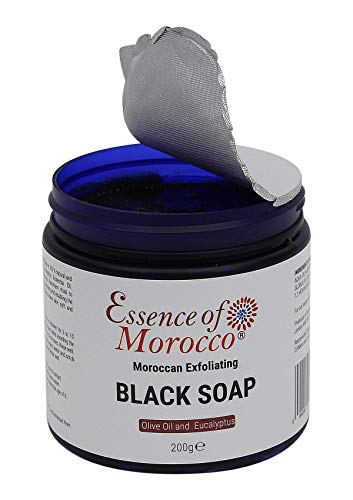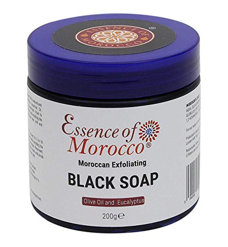 Sapone nero esfoliante tradizionale marocchino macchia Beldi fatta con olio d'oliva e olio essenziale di eucalipto è quintessenza per il rituale marocchino Hammam.