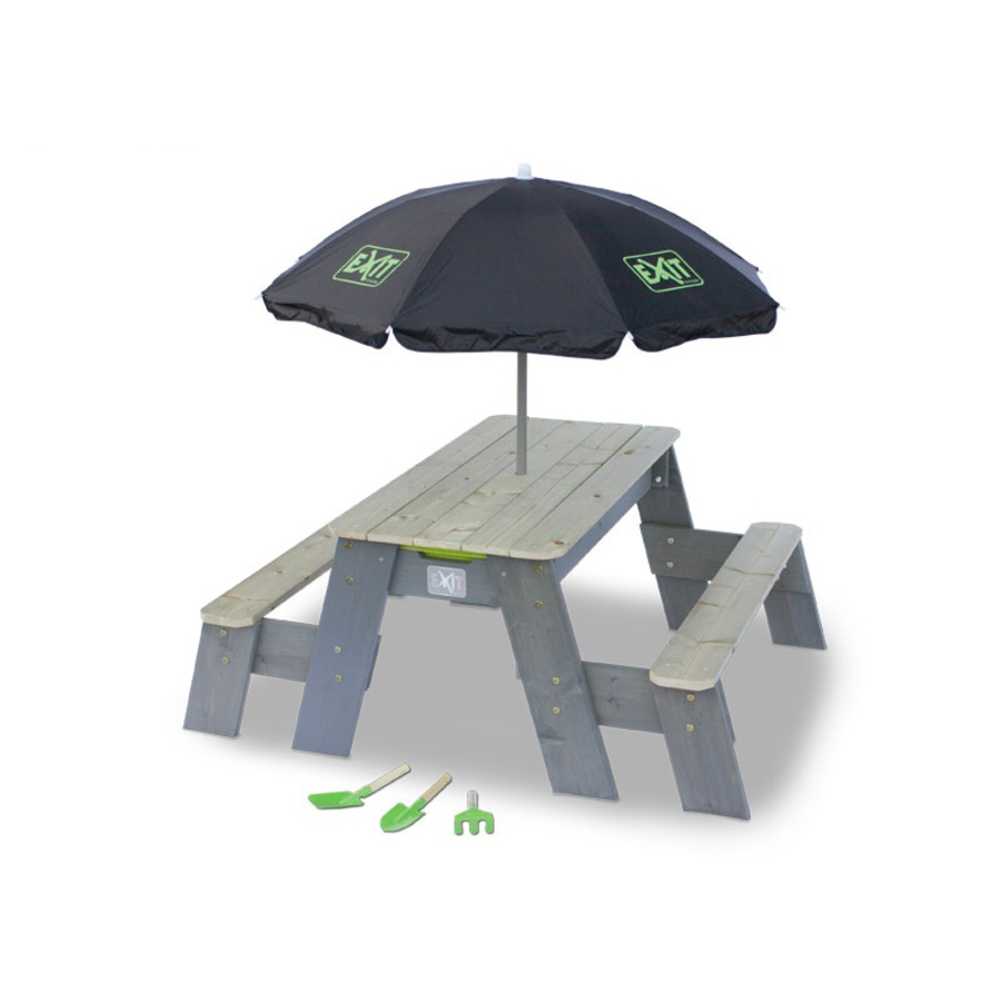 Il tavolo da picnic, sabbia e acqua di EXIT Aksent con due panche è multifunzionale. Ha due scatole verdi che possono essere riempite con acqua o sabbia, ma ci si possono anche riporre dei giocattoli. Le scatole verdi sono rimovibili e quindi facili da pulire. Questo tavolo viene fornito con un ombrellone e attrezzi da giardino per un divertimento ancora maggiore. Sei stanco di giocare con la sabbia e l'acqua? Puoi coprire il tavolo con il coperchio e utilizzarlo per colorare, disegnare, fare lavori manuali e tanto altro. Con questo fantastico tavolo puoi vivere le avventure più incredibili! Dettagli del prodotto: Dimensioni (lunghezza x larghezza x altezza): 120 x 94 x 50 cm Contenuto: tavolo da picnic con due panche, coperchio, due scatole verdi, ombrellone, attrezzi da giardino, istruzioni Design elegante, uso multifunzionale Capacità di carico massimo: 45 kg (per sedile) Materiale: legno di cedro Età: da 3 anni