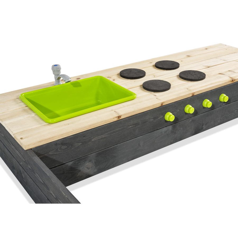 La scatola EXIT Aksent in legno sand è una grande scatola rettangolare Sand . Il box Sand è dotato di una panca, di uno spazio per riporre gli oggetti e di una cucina con accessori da cucina e garantisce tanto divertimento ai bambini. Preparate deliziose torte Sand e cupcake di fango e vivete le migliori avventure nel vostro giardino con questa scatola di legno Aksent sand di EXIT Toys . Il piano di lavoro della cucina è dotato di un fornello con manopole e di un lavello con un vero e proprio rubinetto. Il rubinetto funziona quando vi si collega il tubo da giardino e, grazie al lavandino estraibile, l'acqua del rubinetto può essere facilmente rimossa dal lavandino. Sotto il piano di lavoro della cucina c'è un ampio spazio per riporre tutti i giocattoli, come le pentole, quando i bambini hanno finito di giocare. Le scatole in legno Aksent sand di EXIT Toys sono facili da montare e molto robuste. Le tavole preforate sono fissate agli angoli con i raccordi Metal l, che rendono la scatola Sand robusta. Gli angoli sono di un verde particolare e conferiscono alle scatole Sand un aspetto modern in combinazione con il legno grigio. Le scatole Sand di EXIT Toys sono realizzate in legno di cedro certificato FSC® (FSC 100%, SCS-COC-000652-WH ). Questo tipo di legno non si scheggia ed è naturalmente resistente agli agenti atmosferici come la pioggia e quindi alla marcescenza. Non è necessario trattare le scatole di legno EXIT Sand prima dell'uso, i bambini possono giocarci subito in tutta sicurezza. Dettagli del prodotto: Dimensioni (lunghezza x larghezza): 200 cm x 140 cm Materiale: legno di cedro Bordi robusti Metal Uscita più grande - Sand box Cucina con accessori da cucina Rubinetto dell'acqua funzionale Pratico spazio di archiviazione Legno sostenibile 100 % FSC Carico massimo: circa 30 kg per sedile Età: da 3 anni Incluso come standard Box sand in legno con panca (200 x 140 cm) Piano di lavoro della cucina con fornelli e manopole Lavabo con rubinetto funzionale Accessori