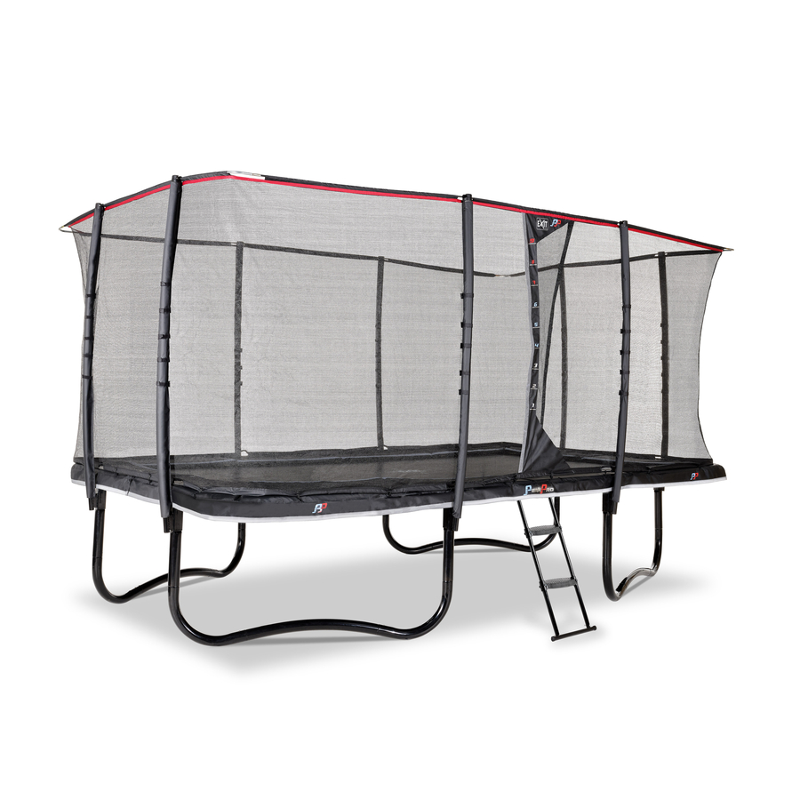 Il trampolino EXIT PeakPro con rete di sicurezza è un trampolino rettangolare con un bordo di protezione nero opaco e un comfort di salto di prima classe. Il telaio nero, i sottili dettagli di colore e le tubature riflettenti conferiscono a questo grande trampolino un aspetto robusto: un capolavoro in qualsiasi giardino. Questo trampolino viene fornito con una scala inclusa, in modo da poter salire sul trampolino in modo sicuro e veloce. Con il trampolino PeakPro in giardino, i bambini amano saltare per mostrare le loro abilità. Cielo alto I trampolini PeakPro sono adatti a bambini con molta esperienza di salto. Le molle di salto flessibili del trampolino EXIT PeakPro sono lunghe non meno di 25 centimetri e rendono facile saltare a grandi altezze. Pratica trucchi acrobatici sulla grande superficie di salto e diventa un vero professionista. La rete di sicurezza standard è dotata di un indicatore di salto in modo che tutti possano vedere quanto in alto si può saltare. Sfida i tuoi amici e vedi chi riesce a superare per primo il nove sulla lama che salta. Robusto trampolino di altissima qualità La qualità assoluta del trampolino EXIT PeakPro si riflette, tra le altre cose, nel telaio. I piedi e il tubo superiore sono extra spessi con un diametro di 60 millimetri. In qualsiasi condizione atmosferica e con i salti più selvaggi, il trampolino rimane stabile al suo posto. Il telaio del trampolino è anche galvanizzato e verniciato a polvere per prevenire la ruggine. Quindi, saltiamo! Qualità e sicurezza sono sempre insieme su EXIT Toys . La rete di sicurezza di alta qualità del PeakPro e il robusto bordo di protezione ti proteggono in caso di errore nel salto. E lo speciale sistema di protezione dei piedi assicura che non rimaniate incastrati tra le molle quando saltate. Con un trampolino EXIT PeakPro puoi praticare tutti i tuoi trucchi del trampolino in modo sicuro ogni giorno! Dettagli del prodotto: Dimensioni (lunghezza x larghezza): 275 x 458 cm Dimensioni (lunghezza x