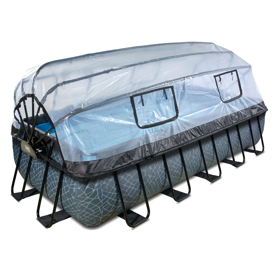 La piscina EXIT Stone 540 x 250 x 100 cm è una piscina rettangolare con struttura grigia e copertura. La piscina è dotata di serie di una pompa filtro Sand, di una pompa di calore e di una scaletta che consente di entrare e uscire dalla piscina in tutta sicurezza. Le piscine a telaio con copertura di EXIT Toys sono multifunzionali, resistenti e la soluzione perfetta per il tempo instabile dell'estate! Rubate la scena con una piscina rotonda di EXIT Toys ! La piscina Stone ha un modern es e un forte motivo di pietra sulla parete laterale, che la rendono un vero e proprio richiamo visivo nel giardino. La piscina EXIT ha pareti robuste a 3 strati in PVC e poliestere e l'interno della piscina è blu per una sensazione di freschezza. Copertura multifunzionale per piscina Con la copertura per piscina EXIT non dipendete più dalle previsioni del tempo. La copertura garantisce che non vi siano infiltrazioni di sporco nell'acqua ed è anche una soluzione sostenibile per il riscaldamento dell'acqua, perché il calore del sole viene trattenuto sotto la copertura. Il coperchio è trasparente e molto facile da aprire grazie alla molla a gas integrata. La copertura è inoltre dotata di quattro finestre pieghevoli. In breve: godetevi la vostra piscina con qualsiasi tempo. Accessori per piscina di alta qualità La piscina EXIT Stone comprende diversi accessori. La pompa filtro Sand pulisce la piscina dalle particelle più piccole pompando l'acqua attraverso un letto filtrante. In questo modo si evita che sporco come Sand, insetti o alghe finiscano nel filtro. La pompa di calore inclusa completa la piscina. La pompa di calore è collegata alla pompa del filtro Sand e può riscaldare l'acqua a ben 40 gradi. La pompa filtro di alta qualità Sand e la pompa di calore compatta sono un vero valore aggiunto per la vostra piscina e vi offrono ore di piacere di nuoto fin dall'inizio della stagione. Stabile e forte! Il telaio della piscina non è solo unico, ma anche robusto e resistente. Il telaio in a