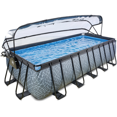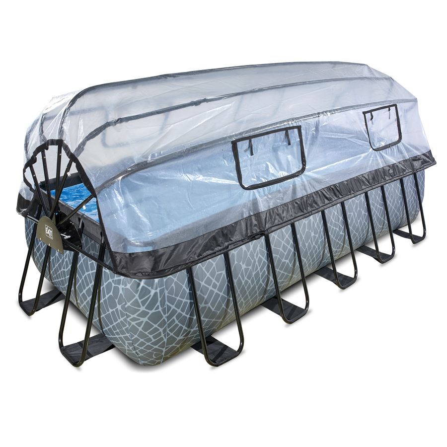 La piscina EXIT Stone 540 x 250 x 122 cm è una piscina rettangolare con struttura grigia e copertura. Questa grande piscina è dotata di serie di una pompa filtro Sand, di una pompa di calore e di una scaletta che consente di entrare e uscire dalla piscina in tutta sicurezza. La piscina con struttura offre spazio sufficiente per sguazzare su un materassino gonfiabile. Preferisci immergerti? La piscina EXIT Stone ha una profondità di 122 centimetri, per cui è possibile immergersi davvero sott'acqua. Le piscine a telaio con copertura di EXIT Toys sono multifunzionali, resistenti e la soluzione perfetta per il tempo instabile dell'estate! Rubate la scena con una piscina rotonda di EXIT Toys ! La piscina Stone ha un modern e forte motivo di pietra sulla parete laterale, che la rende un vero e proprio richiamo visivo nel giardino. La piscina EXIT ha pareti robuste a 3 strati in PVC e poliestere e l'interno della piscina è blu, per una sensazione di freschezza. Copertura multifunzionale per piscina Con la copertura per piscina EXIT non dipendete più dalle previsioni del tempo. La copertura garantisce che non vi siano infiltrazioni di sporco nell'acqua ed è anche una soluzione sostenibile per il riscaldamento dell'acqua, perché il calore del sole viene trattenuto sotto la copertura. Il coperchio è trasparente e molto facile da aprire grazie alla molla a gas integrata. La copertura è inoltre dotata di tre finestre pieghevoli e di una porta. In breve: godetevi la vostra piscina con qualsiasi tempo. Accessori per piscina di alta qualità La piscina EXIT Stone comprende diversi accessori. La pompa filtro Sand pulisce la piscina dalle particelle più piccole pompando l'acqua attraverso un letto filtrante. In questo modo si evita che sporco come Sand, insetti o alghe finiscano nel filtro. La pompa di calore inclusa completa la piscina. La pompa di calore è collegata alla pompa del filtro Sand e può riscaldare l'acqua a ben 40 gradi. La pompa filtro di alta qualità Sand e la pompa d