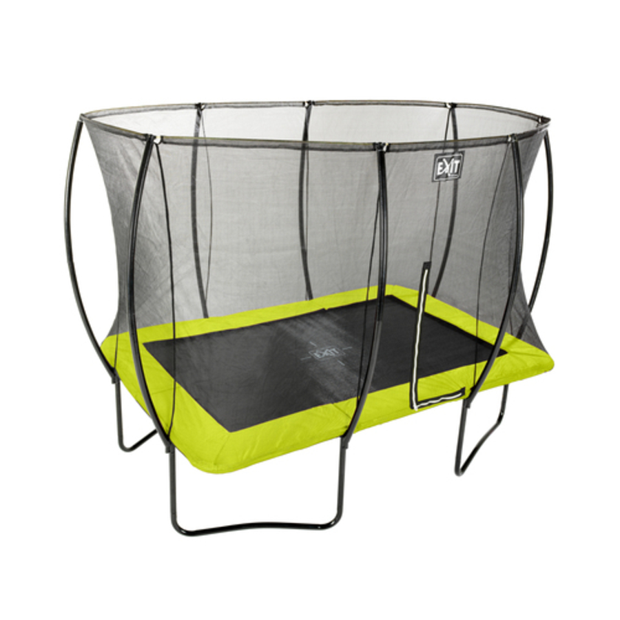Il trampolino rettangolare e compatto Exit ha un bordo protettivo nero . La rete di sicurezza, fornita di serie col trampolino, è dotata di montanti curvi in modo che la rete rimanga tesa. Questo non solo extra è sicuro perché i bambini non possono aggrovigliarsi nella rete, ma non causerà problemi di disordine in giardino. La rete di sicurezza è dotata di una sorprendente cerniera verde fluorescente in modo da poter capire se la cerniera è ben chiusa. Il bordo di protezione di alta qualità copre completamente le molle zincate ed è dotato di un sistema di protezione del piede appositamente sviluppato per far sì che il piede non possa finire tra le molle. Le forti molle garantiscono un super rimbalzo. Il telaio del trampolino è di zinco e verniciato a polvere in modo che la ruggine non abbia alcuna possibilità. I trampolini EXITsono ottimi, solidi e offrono un divertimento senza fine per i tuo bambini! Dettagli: Modello: Trampolino da giardino Con sistema di protezione del piede Materiale: PP (polipropilene) Dimensioni: 244 x 366 cm Peso: 85 kg Peso massimo utilizzatore: 120 kg Età: da 3 anni Incluso manuale di istruzione scheda di sicurezza Bordo di protezione nero 72 molle zincate di 16,5 cm 4 piedi di metallo Rete di sicurezza con cerniera Gancio a molla Istruzioni