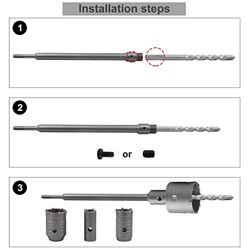 【Contenuto della confezione】: 3 punte a corona cava da 30/40/5050 mm, 2 viti di fissaggio, 1 punta di centraggio da 110 mm, 1 asta di prolunga SDS Plus da 330 cm, 1 chiave inglese.