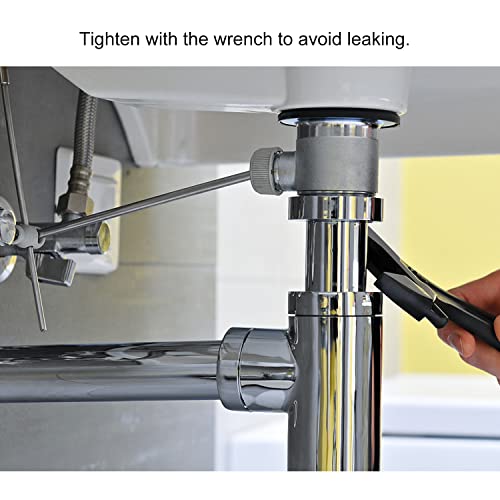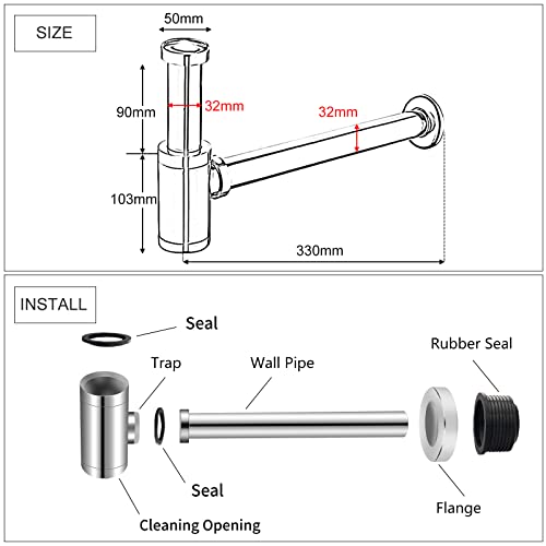 Dimensioni universali: dimensioni standard da 1¼, diametro 32 mm, adatto a tutti i lavandini standard. La lunghezza del tubo di ammollo è di 110 mm, regolabile 95 mm. La lunghezza del tubo di collegamento è di 330 mm. Lo scarico da avvitare è adatto per tutti i lavabi standard da 1 ¼" con foro di fuoriuscita.