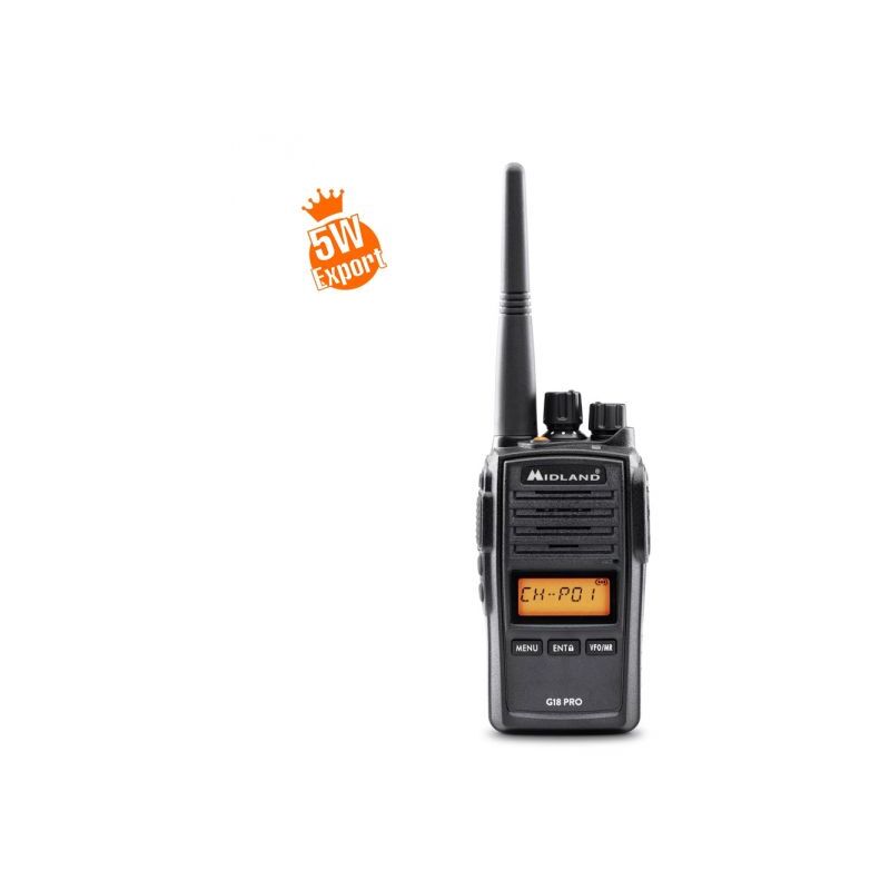 Midland G18 PRO Versione Export 5W Ricetrasmettitore PMR446 Impermeabile IP67 antenna SMA - C1145.02 Questo apparato non è utilizzabile in Italia Il modello più avanzato della gamma di walkie talkie PMR446 diventa Professionale. Mantiene il telaio robusto costruito secondo standard militari, uno schermo ad alta visibilità, certificazione IP67 resistente alla polvere e all'acqua, è in grado di resistere agli ambienti più difficili. Aggiunge al modello precedente la funzione RRM channel, un richiamo veloce al canale rete radio montana, programmabile da software. G18 Pro risponde a tutti i tipi di esigenze ed utilizzo. Il Walkie Talkie indistruttibile Scegliere una ricetrasmittente significa poter comunicare su larghe distanze, in piena libertà, con dispositivi resistenti, senza dover sottoscrivere nessun tipo di abbonamento. G18 Pro è la risposta a tutte queste esigenze. E' il modello più avanzato della gamma per comunicare nella banda di frequenza del PMR446. Un walkie talkie che non