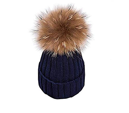 EXQULEG - Berretto caldo per l'inverno con pompon in vera pelliccia di procione, Blu scuro, Taglia unica