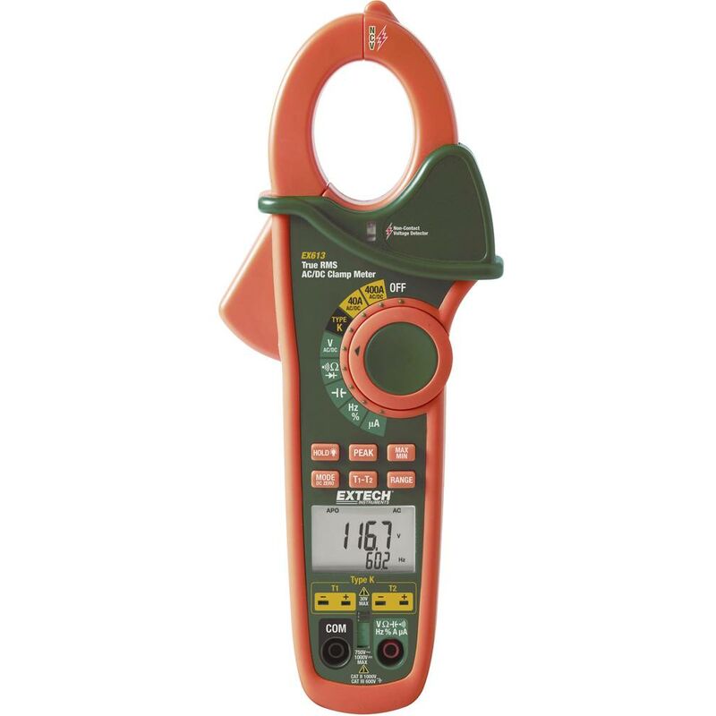 Dettagli tecnici Altezza 241 mm Calibrato di fabbrica senza certificato Dimensioni (L x A) 96 mm x 241 mm Indicatore (digitale/meccanico/analogico) digitale Interfacce nessuna Intervallo di misura A / AC max 400 A Intervallo di misura A / AC min. 0.01 A Intervallo di misura resistenza 0,01 Ω - 40 MΩ Larghezza 96 mm Misura di corrente AC/DC Peso 386 g Precisione (più / meno) 1.5 % Resistenza interna CA 10 MΩ Resistenza interna CC 10 MΩ Tensione di alimentazione (dettagli) Batteria da 9 V Tipo prodotto Pinza amperometrica Amperometro a pinza EX-613 Pinza amperometrica All-in-one. Misurate il valore vero effettivo (True-RMS). Anche con segnali di misura asimmetrici lo strumento di misurazione mostra sempre valori precisi. La visualizzazione avviene su un Dual-Display, la rapida funzione Peak-Hold consente di misurare in modo affidabile le correnti di avviamento e le correnti continue. È presente un intervallo di misurazione aggiuntivo della corrente continua µA per la tecnologia di