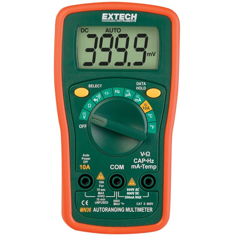 Il multimetro digitale Extech MN36 è un misuratore compatto e, tuttavia, del tutto funzionale. Capace di misurare tensioni CA e CC fino a 600 V, il modello MN36 dispone di range automatico, il che significa che visualizza automaticamente le letture con la posizione decimale corretta e la massima risoluzione. È fornito con fondina protettiva in gomma, 2 batterie AAA, sonda di temperatura tipo K a filo e cavi di misura.