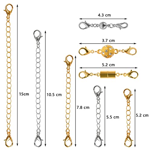【Varie dimensioni e stili】 Viene fornito con 6 chiusure magnetiche per gioielli e 8 extender per collana. Lunghezza degli espansori: 3 cm, 5 cm, 7,5 cm, 10 cm. Chiusure per gioielli 3 stili: sfera di strass, sfera e cuboide, 2 colori: argento e oro, 7 pezzi ciascuno, per soddisfare le diverse esigenze.