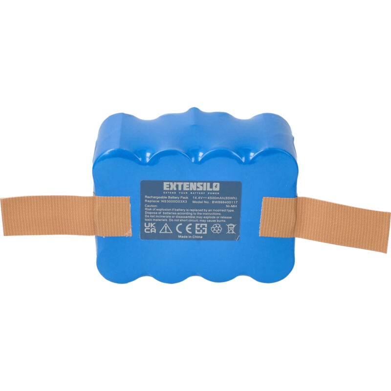 Batteria ricaricabile di ricambio, compatibile e di alta qualità, ad alta capacità, per robot aspirapolvere o robot / dispositivo per la pulizia della casa (Può trovare tutti i modelli corrispondenti qui di seguito) - La batteria può essere caricata con il Suo caricabatterie standard o con uno compatibile - Le nostre batterie ricaricabili soddisfano tutti i requisiti rilevanti per la sicurezza operativa Inoltre, nelle nostre offerte è possibile trovare cartucce profumate, per profumare l'ambiente mentre si usa l'aspirapolvere o il robot aspirapolvere. CONTENUTO DELLA SPEDIZIONE: - 1x batteria ricaricabile SPECIFICHE TECNICHE: - Tecnologia: NiMH - Capacità: 4500 mAh - Tensione: 14,4 V - Energia: 65 Wh - Numero di celle: 12 COMPATIBILE CON: - bObsweep 017144-TN - bObsweep BObi Pet Robotic - bObsweep BQBS1000 - bObsweep BQBS1003 - bObsweep bObi Classic Per garantire la compatibilità, verificare se la batteria ricaricabile attualmente in uso è presente nell'elenco. SOSTITUISCE