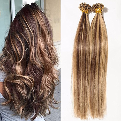 Extension Capelli Veri Cheratina Ciocche 1 Grammo/Ciocca con Meche Pre Bonded U Tip Allungamento 100% Remy Human Hair - 45cm 50g #4/#27 Marrone Cioccolato/Biondo Scuro