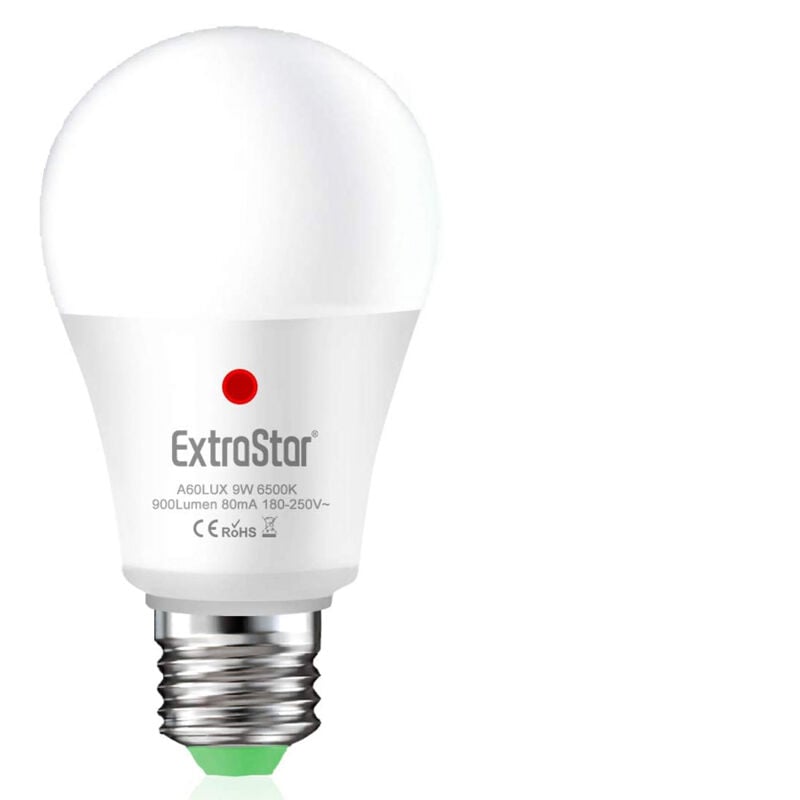 Lampada Led Attacco E27 Con Sensore Crepuscolare A60 Forma Sfera Bulbo Standard 220V 9W 900lm Bianco Freddo 6500KAngolo 200 Gradi Diametro 60mm Altezza 110mm Si Accende Automatico Quando Diventa Buio Marca EXTRASTAR Codice Prodotto LC27A60LUXF Attacco E27 A60 Dimmerabile NO Sensore Si,Sensore Crepuscolare Voltaggio AC180-250V Potenza 9W Luminosità 900 Lumen CRI RA>80 Angolo Luce 200 Gradi Colore Bianco Freddo 6500K Impermeabilità IP20 Misura Diametro 60mm, Lunghezza Totale 110mm Durata > 25000 ore Omologazione SI, CE e RoHS Nota Bene Con Sensore Crepuscolare