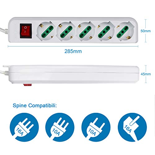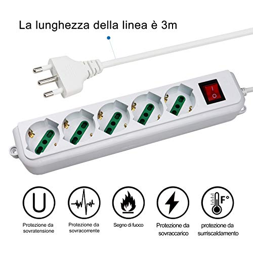 5 uscite con presa di corrente con spine Ita 10A/16A Schuko, ciabatta dotata di fori con protezione per bambini.